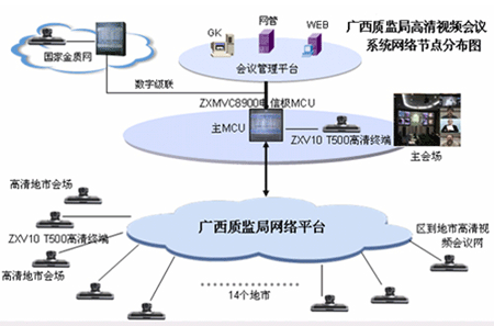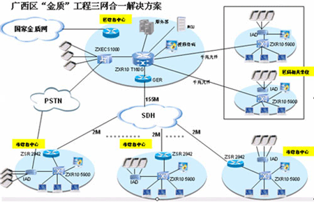 憑借全面的融合通信產(chǎn)品和解決方案、豐富的電子政務(wù)工程建設(shè)和實施經(jīng)驗,中興通訊為廣西“金質(zhì)工程”(一期)系統(tǒng)“量身定做”出一整套基于IP融合、使用方便靈活的解決方案:將整個系統(tǒng)分為兩個部分,即區(qū)質(zhì)監(jiān)局一級節(jié)點信息中心、各地市質(zhì)監(jiān)局及相關(guān)研究機(jī)構(gòu)共計15個二級節(jié)點信息中心,在管理上體現(xiàn)垂直的系統(tǒng)架構(gòu)。整個網(wǎng)絡(luò)可以看作一個分級的星形網(wǎng)絡(luò),結(jié)構(gòu)簡單、易于擴(kuò)展。