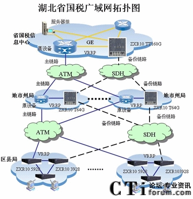 湖北省國稅三級(jí)專網(wǎng)已經(jīng)建成,但是存在單點(diǎn)單鏈路隱患,為了保證網(wǎng)絡(luò)可靠運(yùn)行,2006年湖北國稅攜手中興通訊對省國稅系統(tǒng)的網(wǎng)絡(luò)進(jìn)行備份網(wǎng)絡(luò)改造,結(jié)合稅務(wù)系統(tǒng)金稅三期網(wǎng)絡(luò)需求,網(wǎng)絡(luò)改造采用SDH線路來組建高帶寬的廣域網(wǎng)絡(luò),同時(shí)與原有的網(wǎng)絡(luò)設(shè)備(包括路由器、交換機(jī))及網(wǎng)絡(luò)接入設(shè)備實(shí)現(xiàn)互連互通,互為備份。