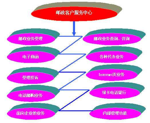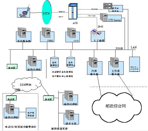 郵政呼叫中心在現(xiàn)有郵政綜合網(wǎng)的基礎(chǔ)上,利用電話服務(wù)廣泛普及,方便快捷的優(yōu)點(diǎn),采用CTI技術(shù),把綜合網(wǎng)提供的諸多并行的多種業(yè)務(wù)無(wú)縫集成,為綜合網(wǎng)提供一個(gè)集成多種服務(wù)功能為一體的橫向服務(wù)。