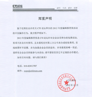 2.將相應(yīng)電子文檔以電子郵件附件形式發(fā)送到:expo@ctiforum.com,郵件主題為:CTI論壇2012年度“編輯推薦獎”