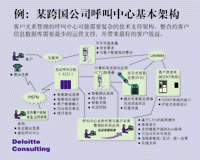 ---- 圖示是一個由德勤咨詢公司為一全球性客戶提出的呼叫中心建議,呼叫中心經常需要這樣復雜的一個技術平臺和基礎支持才可能實現快速的來電和去電處理。