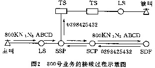 --用戶在撥打800號業(yè)務用戶號碼時,首先由網絡點上的普通電話交換機接收,并把800KN1N2ABCD號碼經話路傳送給業(yè)務交換點SSP,再由SSP將此號碼經No.7信令鏈路送到業(yè)務控制點SCP,SCP通過在業(yè)務數據庫SDP中查尋譯碼表將此號碼翻譯成普通的電話號碼回送SSP,最后由SSP負責完成電路的連接,該過程如圖2所示。