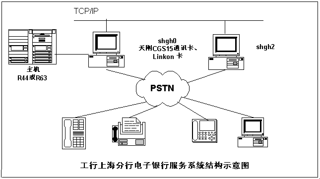 該系統(tǒng)以IBM提供的 R63和R44主機(jī)為中心,一臺(tái)Unix通信前置機(jī)通過(guò)CGS15通信卡與主機(jī)相連。該前置機(jī)與另一臺(tái)前置機(jī)連成局域網(wǎng),對(duì)外提供74線語(yǔ)音、傳真和MODEM服務(wù)。今后隨著業(yè)務(wù)的增長(zhǎng),可以通過(guò)增加通信前置機(jī)方式,增加對(duì)外服務(wù)線路,從而使系統(tǒng)具有良好的開(kāi)放性和擴(kuò)展能力。
