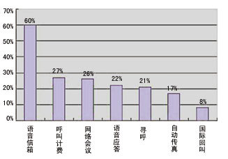 從企業(yè)所使用的CTI應(yīng)用服務(wù)來(lái)看:最多的是語(yǔ)音信箱(Voice Mail)為 60%。呼叫計(jì)費(fèi)(Call Accounting)為27%,網(wǎng)絡(luò)會(huì)議(Conferencing)為26%。語(yǔ)音應(yīng)答(IVR)為22%。由于CTI在我們國(guó)家,這一兩年才得到比較快的發(fā)展,所以應(yīng)用層次還不是很高。還有一個(gè)原因是有些CTI技術(shù)的應(yīng)用在發(fā)展企業(yè)的核心業(yè)務(wù)方面作用不大,所以像Audio TEX、Powers Dialers等一些應(yīng)用就比較少。