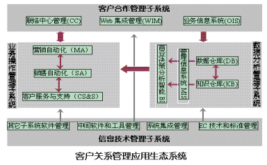 根據(jù)目前IT產業(yè)領域和管理界對CRM的開發(fā)、討論及應用的經(jīng)驗和反饋,綜合來講,一個完整的客戶關系管理應用系統(tǒng)由如下四大生態(tài)子系統(tǒng)組成: