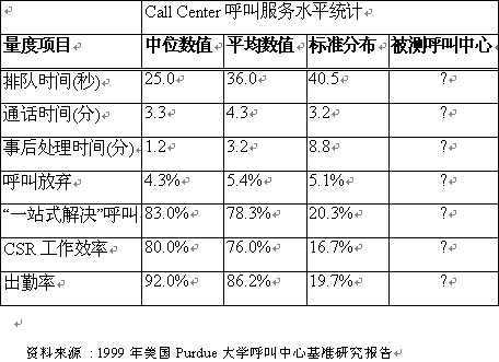 以下是Purdue大學(xué)1999年Benchmarking研究報(bào)告的部份內(nèi)容,顯示了美國分別在15個(gè)不同行業(yè)的Call Center的基準(zhǔn)測試數(shù)據(jù)。