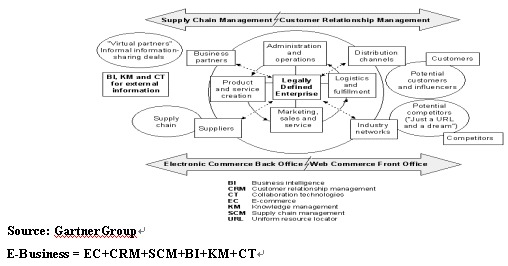 在 GartnerGroup 的一個(gè)名為“如何制定一個(gè)可操作的、有效的電子商務(wù)戰(zhàn)略”的報(bào)告中描述了電子商務(wù)(E-Business)的所有基本要素,他們是商業(yè)智能(BI),客戶(hù)關(guān)系管理(CRM),供應(yīng)鏈管理(SCM),知識(shí)管理(KM), 協(xié)同技術(shù)(CT) 和E-Commerce。這些要素將成為新的一輪電子商務(wù)浪潮的特征。一些公司如 Dell, IBM,已經(jīng)成為這一輪變革中成功的代表。