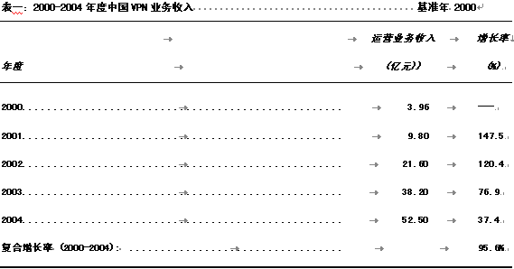 2000年,中國VPN運(yùn)營業(yè)務(wù)收入為人民幣3.96億元,主要業(yè)務(wù)提供商為新興的電信運(yùn)營商如網(wǎng)通、吉通、聯(lián)通等公司,以及數(shù)量可觀的或明或暗的網(wǎng)絡(luò)公司,VPN用戶主要集中在規(guī)模較大的外企、金融領(lǐng)域以及與IT相關(guān)的企業(yè)之中。隨著更多的虛擬運(yùn)營商進(jìn)入VPN服務(wù)市場(chǎng),以及企業(yè)成本意識(shí)的不斷增強(qiáng),VPN用戶群體已經(jīng)呈擴(kuò)散之勢(shì),制造業(yè)、FMCG連鎖經(jīng)營業(yè)、酒店業(yè)等已經(jīng)迅速進(jìn)入這一市場(chǎng)。預(yù)計(jì)到2004年度,國內(nèi)VPN業(yè)務(wù)收入可以達(dá)到52.5億元人民幣,年復(fù)合增長(zhǎng)率為95.6%。各年度測(cè)算數(shù)據(jù)見表一。