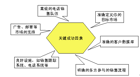 企業(yè)實(shí)施電話銷售成功與否,與幾個(gè)關(guān)鍵要素有關(guān)系,我稱它們?yōu)殡娫掍N售的關(guān)鍵成功因素,如下圖: