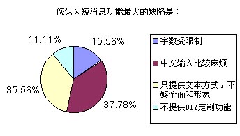 不出所料,題3的答案A~D被選比率依次為15.56%、37.78%、35.56%和11.11%。這個結果很明顯地顯示出現(xiàn)在用戶認為SMS的缺陷主要集中在文本形式限制和不夠全面、生動上,而MMS特有的容量和DIY優(yōu)勢并不被最終用戶特別看好,這多少讓將來經(jīng)營MMS的CP們感到難堪。