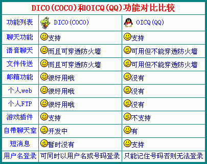 呵呵,前一陣子駕鼠逛網(wǎng),我發(fā)現(xiàn)了一款類似于時(shí)下QQ但比時(shí)下QQ還要好用且功能還要多的出色的新型的中文網(wǎng)絡(luò)即時(shí)通信工具軟件----夢(mèng)幻尋呼DICO 2002!它集"一般聊天、語音聊天、文件傳送、郵箱功能、個(gè)人web/FTP、支持游戲插件、自帶聊天室"等功能于一體且可同時(shí)以用戶名或號(hào)碼登錄,開辟了網(wǎng)絡(luò)通訊軟件的新境界。是由深圳聚才網(wǎng)絡(luò)科技發(fā)展有限公司開發(fā)的共享軟件,最近版本是DICO1.11版,適用于Win 9X/NT/2K等操作系統(tǒng),語言界面為全中文界面,下載后的可執(zhí)行文件僅2.55M大!圖1:與時(shí)下QQ的功能對(duì)比表