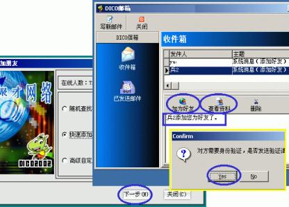 3、點(diǎn)按主窗口下方的"覓友"按鈕,彈出的對(duì)話框中選擇三種添加方式之一后按"下一步"進(jìn)行好友的添加;當(dāng)有人加你為好友時(shí),系統(tǒng)會(huì)有提示音閃并DICO圖標(biāo)在任務(wù)欄不斷閃爍,你點(diǎn)擊上來后會(huì)彈出你的DICO郵箱對(duì)話框并收到有某某加你為好友的消息,此時(shí)可先點(diǎn)按"查看資料"了解一下來人相關(guān)信息;若有意可點(diǎn)按"加產(chǎn)好友"加來訪者為好友(下圖7)。