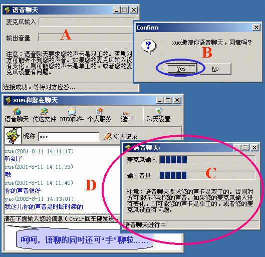 在好友窗口內(nèi)單擊某"在線好友頭像"后選"語音聊天"命令(或在即時(shí)聊天窗口中點(diǎn)按"語音聊天"按鈕)后,主動(dòng)方彈出"正等待對(duì)方應(yīng)答窗口提示";而被叫方會(huì)彈出"應(yīng)答與否的窗口","YES"后雙方即可聊了(下圖9)。而且,它不受防火墻的限制(下圖就是我與一個(gè)在防火墻后的朋友的聊天界面)。在這一點(diǎn)上,QQ就望塵莫及了!