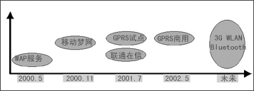 2000年5月,中國(guó)移動(dòng)推出了WAP服務(wù),但是由于準(zhǔn)備不足,加之中國(guó)移動(dòng)沒(méi)有完全轉(zhuǎn)變經(jīng)營(yíng)理念,使得WAP服務(wù)沒(méi)有達(dá)到預(yù)期的發(fā)展目標(biāo)。在吸取WAP服務(wù)的經(jīng)驗(yàn)、教訓(xùn)后,中國(guó)移動(dòng)于2000年11月又推出了“移動(dòng)夢(mèng)網(wǎng)”計(jì)劃。在這次的業(yè)務(wù)推廣中,短消息受到了人們的寵愛(ài),發(fā)展到現(xiàn)在,SMS已經(jīng)深入多數(shù)移動(dòng)用戶的心中。2001年7月,中國(guó)聯(lián)通也推出了“聯(lián)通在信”與“移動(dòng)夢(mèng)網(wǎng)”進(jìn)行競(jìng)爭(zhēng)(如圖1所示)。與此同時(shí),中國(guó)移動(dòng)又開(kāi)始了GPRS的試點(diǎn)工作,經(jīng)過(guò)近一年時(shí)間,“聯(lián)通在信”并沒(méi)有取得更好的成績(jī),而中國(guó)移動(dòng)的GPRS終于開(kāi)始正式商用。那么,未來(lái)的移動(dòng)數(shù)據(jù)業(yè)務(wù)將依托什么來(lái)發(fā)展呢?是3G,還是WLAN、藍(lán)牙?大家只能拭目以待。