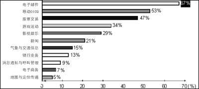 到底有多少人需要移動(dòng)數(shù)據(jù)業(yè)務(wù)呢?有資料顯示,當(dāng)前有36%的人對(duì)移動(dòng)數(shù)據(jù)業(yè)務(wù)處于觀望狀態(tài),只要移動(dòng)數(shù)據(jù)業(yè)務(wù)發(fā)展得好,他們肯定會(huì)加入進(jìn)來(lái)。我們相信,現(xiàn)在已經(jīng)有一定比例的人開(kāi)始從觀望狀態(tài)加入使用移動(dòng)數(shù)據(jù)業(yè)務(wù)的行列中來(lái)。如圖2所示,在用戶需求中,電子郵件占67%,娛樂(lè)性的業(yè)務(wù)也占有較高的比例,新聞、信息類(lèi)其次。這些數(shù)據(jù)說(shuō)明,人們使用移動(dòng)數(shù)據(jù)業(yè)務(wù),大部分的習(xí)慣是沿襲互聯(lián)網(wǎng)的,這也為移動(dòng)網(wǎng)絡(luò)與互聯(lián)網(wǎng)的結(jié)合奠定了用戶基礎(chǔ)。