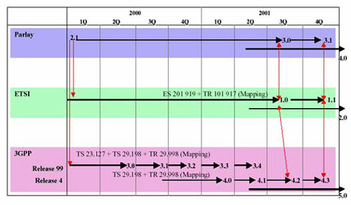 1998年4月,Parlay工作組成立,成員主要有英國電信、Ulticom 、微軟 、北電 、西門子組成,并于1998年12月出版提出最初的版本。Parlay工作組的目標(biāo)是通過規(guī)范開放應(yīng)用程序接口,聯(lián)合IT應(yīng)用和通信應(yīng)用的開發(fā)能力,促使通信應(yīng)用數(shù)量的飛速發(fā)展。1999年5月,隨著AT&T、Cegetel、Cicso、Ericsson、IBM和Lucent等6個(gè)新成員的加入,成員總數(shù)增加至共11名。2000年1月API2.0出版,僅6個(gè)月后,API2.1出版。在2001年2月,Parlay工作組成員增加至37個(gè),并推出Parlay3.0。Parlay