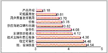 用戶認為重要性一般但偏向重要3.5≤Y<4的指標有供應(yīng)商的口碑、價格、用戶界面友好易用、可拓展升級四項。十項指標中消費者最低的也是評價重要性一般3≤Y<3.5的指標是產(chǎn)品外觀。視頻會議終端系統(tǒng)界面的友好易用、供應(yīng)商的口碑等相對視音頻質(zhì)量、穩(wěn)定可靠性、安全性等指標而言,重要性稍弱,這反映用戶對系統(tǒng)的要求趨于實際應(yīng)用的高效。而價格指標重要性僅排在十項指標測評的第七位,反映用戶對于視頻會議系統(tǒng)產(chǎn)品的價格敏感度不高,用戶在選購產(chǎn)品時,首先看重的是產(chǎn)品功能質(zhì)量性能。出于這一消費傾向,用戶對于產(chǎn)品外觀重要性評價也自然偏低。