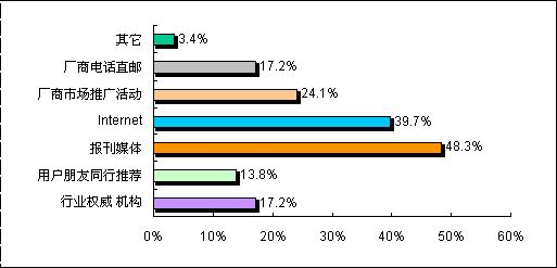 此次調(diào)查顯示,由于視頻會議系統(tǒng)的行業(yè)性相對較強(qiáng),目前用戶在了解視頻終端會議系統(tǒng)產(chǎn)品時,報刊媒體、Internet、廠商推廣活動、廠商電話直郵和行業(yè)權(quán)威機(jī)構(gòu)成為主要的信息來源渠道。值得注意的是網(wǎng)絡(luò)的普及使得更多的用戶也選擇Internet作為了解信息的重要途徑。但對各視頻會議系統(tǒng)的廠商而言,由于客戶群體相對龐大,分散區(qū)域較為廣泛,在作好直銷的同時,也應(yīng)該加強(qiáng)渠道的建設(shè),以更及時和準(zhǔn)確地了解到用戶采購和招標(biāo)的信息,同時也能夠降低銷售成本。