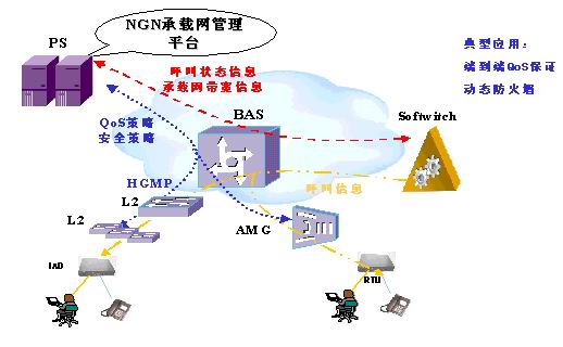 所有用戶接入BAS,BAS通過(guò)CAR可以對(duì)不同的用戶限制帶寬,PC分配較低的優(yōu)先級(jí)及帶寬,而對(duì)IAD分配較高的優(yōu)先級(jí)和帶寬,防止普通用戶對(duì)帶寬的無(wú)節(jié)制濫用。PS可以動(dòng)態(tài)收集BAS設(shè)備的帶寬使用情況,同時(shí)通過(guò)與軟交換的交互,了解NGN業(yè)務(wù)的帶寬需求,從而在BAS上可按用戶及業(yè)務(wù)的粒度進(jìn)行動(dòng)態(tài)QoS策略配置,為用戶提供差異性業(yè)務(wù),保證用戶的SLA。PS可以下發(fā)QoS策略給BAS,BAS交換機(jī)可以進(jìn)一步通過(guò)協(xié)議(各廠家私有協(xié)議)下發(fā)QoS策略給下掛的L2交換機(jī)。