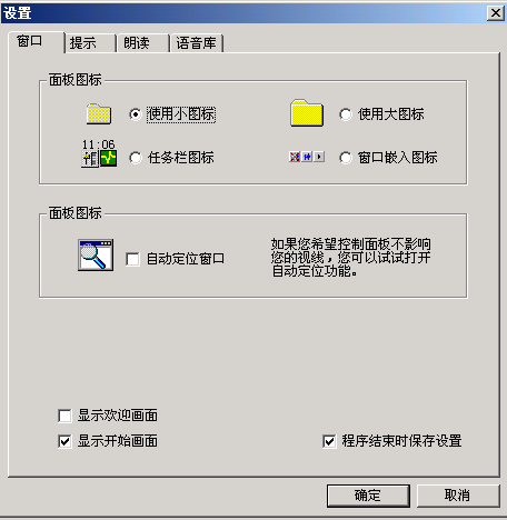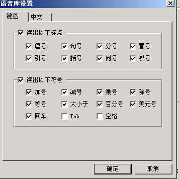如果需要進(jìn)一步的調(diào)整,可以選擇菜單里的“設(shè)置……”。打開設(shè)置窗口(如圖3)。窗口共分四個(gè)選項(xiàng),每個(gè)選項(xiàng)里除了剛介紹的幾種常用功能調(diào)整外,還可以控制歡迎畫面、開始畫面、設(shè)定存儲等功能,規(guī)定提示速度、朗讀速度的快慢,選擇提示方式,設(shè)定提示報(bào)警條件。在“語音庫”選項(xiàng)中還可以選擇朗讀為男聲還是女聲。單擊“設(shè)置”按鈕,可以根據(jù)具體需要選擇“鍵盤”或“中文”里被朗讀標(biāo)點(diǎn)符號的種類(如圖4)。