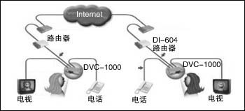 Modem上。圖1通過DI-604路由器與DSL Modem連接,實(shí)現(xiàn)與Internet互聯(lián)。DVC-1000還配備了一個(gè)電話機(jī)接口,可以外接一部普通電話機(jī)作為話音交流和撥號(hào)設(shè)備。