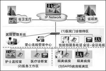 在安裝過程中,醫(yī)院通過原有的網(wǎng)絡(luò)系統(tǒng)就可完成視頻系統(tǒng)的搭建,該系統(tǒng)可應(yīng)用于隔離區(qū)、護(hù)士監(jiān)控室、會(huì)議室、醫(yī)療診斷室、住院部等地方。每個(gè)房間只要安裝一臺(tái)DVC-1000,同時(shí)配備電視機(jī)或投影機(jī)等視音頻播放設(shè)備,通過上面所述的安裝程序,就可以搭建一套互動(dòng)式的視頻系統(tǒng),這樣醫(yī)護(hù)人員只要在監(jiān)控室就可以隨時(shí)觀察隔離區(qū)的病人(如圖2所示)。