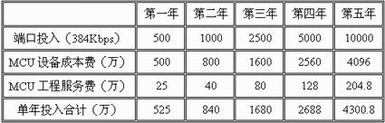 中國網通CNC視訊運營網絡在建網成本上主要考慮四個部分。一是視訊交換平臺MCU部分,主要用于多點視頻通信;二是視訊運營支撐系統(tǒng),包括各種運營所必須的軟件(網管、業(yè)務受理中心、業(yè)務管理中心)及相應的硬件服務器;三是 H.323 視訊系統(tǒng)的關鍵組件GK軟件及相應硬件服務器,其容量和個人視頻通信業(yè)務的發(fā)展情況息息相關;四是投入資金利息。具體可細分如下:表一 MCU設備建維費用