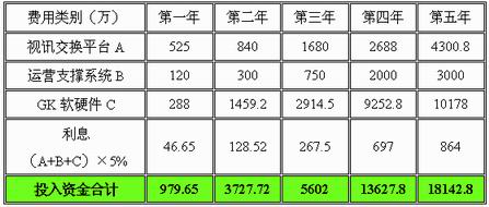 綜合上面三部分成本構成,得出從系統(tǒng)建設并開始運營的頭五年中,各個年份建網資金投入和總投入: