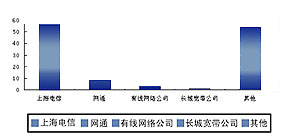 在國內(nèi),視訊市場的形成已經(jīng)初露端倪,眾多商家都開始瞄準(zhǔn)這個新的利潤增長點。2002年8月,上海電信正式將視訊業(yè)務(wù)命名為“新視通”,并陸續(xù)開通了上海至美國洛杉磯、新疆烏魯木齊、石河子、克拉瑪依等地區(qū)的公眾視訊業(yè)務(wù),同時還針對商用客戶和個人用戶啟動了推廣計劃。由于上海是我國的貿(mào)易、金融、經(jīng)濟(jì)中心,許多國內(nèi)外的大型企業(yè)都在上海設(shè)有分支機構(gòu),市場潛力不可估量,眾多運營商都在爭取上海的市場。目前,除了上海電信推出的“新視通”業(yè)務(wù)外,網(wǎng)通、有線網(wǎng)絡(luò)和其它公司都在上海推出了自己的視訊系統(tǒng)。根據(jù)我們對企業(yè)用戶的抽樣調(diào)查,下圖的市場占有率表明了視訊業(yè)務(wù)的競爭將會日益激烈。