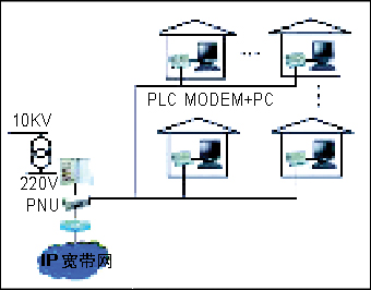 利用普通220V電源線作載體,將IP寬帶信號接入每個家庭的PLC(Power Line Communication)網(wǎng)絡(luò)正在進(jìn)入小區(qū)/樓宇市場。它是通過電力線網(wǎng)絡(luò)單元(PNU)將寬帶接入信號經(jīng)正交頻分復(fù)用(OFDM)調(diào)制、匯入小區(qū)/樓宇電力變壓器用戶輸出線上,再經(jīng)電源線送到各家各戶。PC、IP Phone、Fax設(shè)備均可通過房間內(nèi)部的電源插座寬帶接入Internet。PLC 小區(qū)結(jié)構(gòu)圖