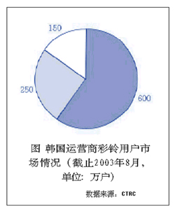 彩鈴業(yè)務(wù)最先是由韓國的SK電信于2002年3月推出的,業(yè)務(wù)一經(jīng)面世就吸引了移動用戶、特別是年青用戶群體的眼球,開通的用戶數(shù)和業(yè)務(wù)使用率呈指數(shù)式增長;同時由彩鈴業(yè)務(wù)帶來的互聯(lián)網(wǎng)、WAP和IVR的話務(wù)量的增長進一步提升了彩鈴業(yè)務(wù)的含金量。隨后韓國的其他兩個移動運營商LG電信和韓國電信也分別于2002年6月和9月相繼開通彩鈴業(yè)務(wù)。經(jīng)過運營商和彩鈴的內(nèi)容提供商的前期市場推廣和運作,目前已發(fā)展了近1000萬用戶,其中運營商的市場份額如圖所示。