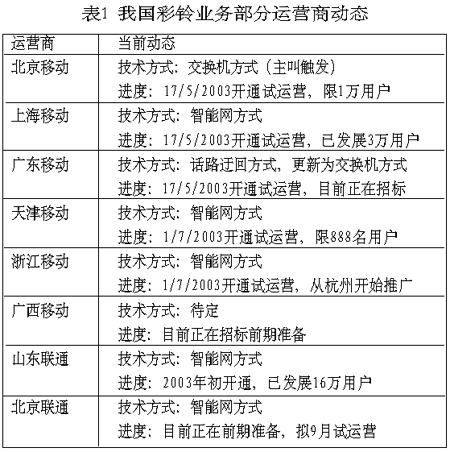 表1總結(jié)了目前我國部分運營商彩鈴業(yè)務(wù)的發(fā)展動態(tài)。