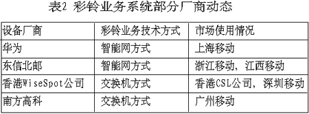 目前市場上有技術(shù)能力提供彩鈴業(yè)務(wù)系統(tǒng)的廠商主要有韓國的設(shè)備商Witcom和 OnionTech21,以及其他國外廠商如Comverse和WiseSpot,國內(nèi)廠商有華為、中興、南方高科、東信北郵等。各廠商都在和移動運營商合作部署其彩鈴業(yè)務(wù)系統(tǒng),力爭成為市場的領(lǐng)先者,如華為在上海移動建設(shè)了其智能網(wǎng)方式的彩鈴業(yè)務(wù)系統(tǒng),通過其原有的智能網(wǎng)系統(tǒng)的更新升級實現(xiàn)彩鈴業(yè)務(wù)。現(xiàn)在已有確切消息證實,彩鈴業(yè)務(wù)將于今年10月1日起正式商用,同時進入商用的還有北京移動的彩鈴業(yè)務(wù)。與此同時,東信北郵也與浙江移動、江西移動合作開通彩鈴業(yè)務(wù),于2003年3月25日彩鈴業(yè)務(wù)通過現(xiàn)網(wǎng)實用測試。