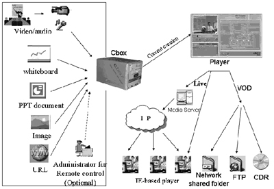 在對(duì)市場(chǎng)上現(xiàn)有產(chǎn)品進(jìn)行了綜合比較后,上海市稅務(wù)局決定使用美國Winnov公司的Cbox系統(tǒng)。Cbox是一種視頻采集和控制系統(tǒng),可以支持多種格式文檔,通過URL方式可以提供對(duì)未來文檔格式的支持,在操作時(shí)只需將文檔提供給Cbox,其余工作由Cbox自動(dòng)完成; 自動(dòng)攝像頭控制可預(yù)設(shè)三個(gè)位置,Cbox自動(dòng)感應(yīng),并支持助教、直播、點(diǎn)播等模式,同時(shí)具有多種分發(fā)方式,可以存在局域網(wǎng)共享目錄、自動(dòng)上傳至FTP和刻錄光盤。