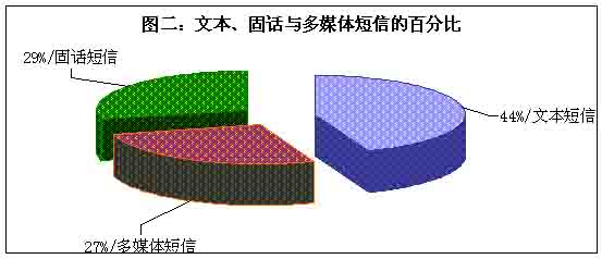 目前市場(chǎng)的主流短信主要有三大類(lèi),即傳統(tǒng)的手機(jī)文本短信、流行的圖音文字兼?zhèn)涞摹安市拧焙托峦瞥龅墓淘挾绦。整個(gè)短信市場(chǎng)確實(shí)火了,但是在火爆的背后哪一種短信是真正的巨無(wú)霸?調(diào)查表明,在三類(lèi)短信之中,選擇文本類(lèi)短信的用戶(hù)最多,占據(jù)44%,其次是固話短信,再次是多媒體短信,即俗稱(chēng)的“彩信”,選擇固話短信和彩信的百分比十分接近。(見(jiàn)圖二)看來(lái),“巨無(wú)霸”非文本類(lèi)短信莫屬。
