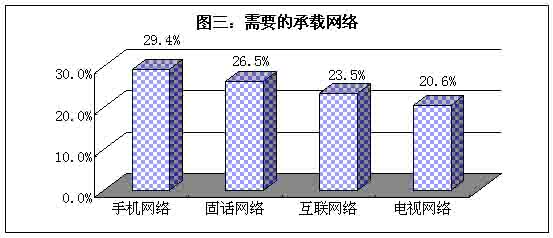首先,手機(jī)構(gòu)成移動(dòng)的網(wǎng)絡(luò)已經(jīng)超過(guò)傳統(tǒng)的龐大的固話網(wǎng)絡(luò),成為用戶(hù)目前用戶(hù)最需要的承載網(wǎng)絡(luò)。這顯然是用戶(hù)市場(chǎng)對(duì)移動(dòng)通訊方式的需求日漸強(qiáng)烈的表現(xiàn)。其次,電視網(wǎng)絡(luò)拉后于固話和互聯(lián)網(wǎng)絡(luò),排在最后一位,這反映了未來(lái)網(wǎng)絡(luò)向雙向溝通發(fā)展的態(tài)勢(shì)。最后,互聯(lián)網(wǎng)絡(luò)雖然早于移動(dòng)網(wǎng)絡(luò)的發(fā)展,而用戶(hù)卻更為看重后者,原因是作為互聯(lián)網(wǎng)絡(luò)終端設(shè)備的電腦,還不能走入普通百姓家庭,因此終端設(shè)備成為互聯(lián)網(wǎng)絡(luò)發(fā)展的門(mén)檻。
