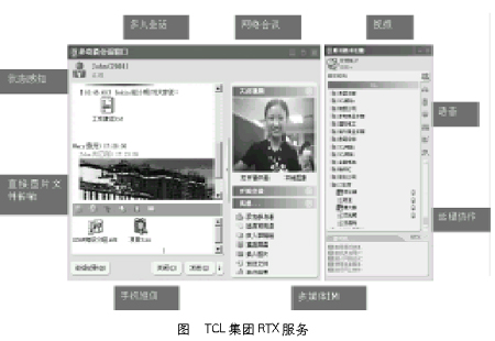 RTX產(chǎn)品支持標(biāo)準(zhǔn)的SIP、H.323 IP電話協(xié)議,并采用高質(zhì)量的QoS技術(shù)保證實(shí)時(shí)通信網(wǎng)絡(luò)質(zhì)量,使得TCL集團(tuán)公司的用戶可以與同事之間采用語音或者視頻的面對(duì)面的交流(如圖),相當(dāng)于給集團(tuán)公司的任何一位RTX用戶配備了一部集成的視頻和語音電話。目前這項(xiàng)服務(wù)在集團(tuán)公司非常受歡迎,尤其是遠(yuǎn)程的代表處和集團(tuán)總部之間的信息交流更直接、更快捷,在一定程度上取代了電話的功能,大大節(jié)約了通信費(fèi)用。比如,TCL空調(diào)的計(jì)劃部每天需要和全國(guó)20多個(gè)代表處的計(jì)劃處進(jìn)行數(shù)據(jù)往來,以前需要電話完成的功能現(xiàn)在通過RTX的即時(shí)文字、短信和語音對(duì)講完成,大大提高效率,節(jié)省了通信成本。