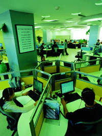 “目前這里每天要處理2000多個電話,一個月的電話量累計高達8萬個。每個坐席代表平均每天處理電話60次左右!彼上码娖鳎ㄖ袊┯邢薰矩撠熀艚兄行臓I運的CRM推進部副部長陳文凱說,“這是一個不輕松的工作崗位,因此,坐席代表的工作環(huán)境和工作待遇得首先得到保證。只有讓他們心情愉快,他們才能笑著去服務(wù)客戶!边@個寬敞舒適的工作大廳,就是基于這樣的思路設(shè)計出來的。每個坐席代表置身于扇形柔色的工作空間內(nèi),既能精力集中,又能避免回復(fù)電話的聲音互相干擾,一定角度的扇形空間發(fā)揮了最大的吸音效果。在大廳旁邊,還專設(shè)坐席代表休息室,每工作2小時后,他們可以到休息室休息一會。