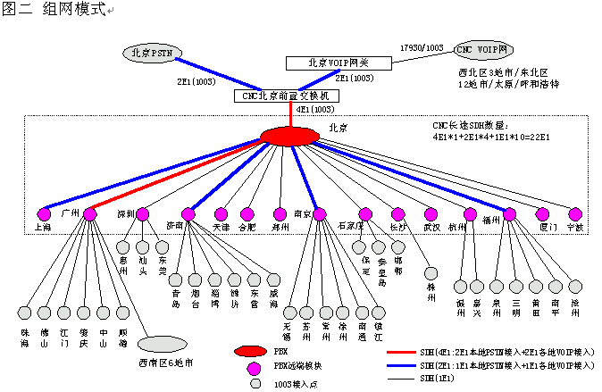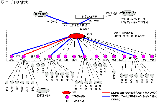 網(wǎng)通的客戶服務(wù)系統(tǒng)(1003呼叫中心)包括位于北京總部的總中心及其它全國(guó)30多個(gè)城市的分中心,全國(guó)范圍共有近200個(gè)接入點(diǎn)(覆蓋城市),共有200余座席,由總中心,交換機(jī)遠(yuǎn)端模塊接入點(diǎn)子中心及軟覆蓋接入點(diǎn)組成的三層架構(gòu)。參見下圖一《系統(tǒng)架構(gòu)》及圖二《組網(wǎng)模式》。