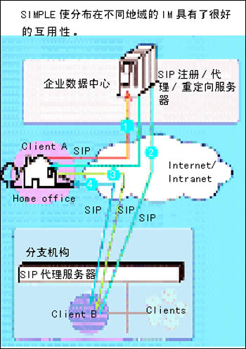 因此,制訂一種統(tǒng)一的協(xié)議就迫在眉睫了。這種統(tǒng)一協(xié)議應(yīng)當(dāng)可用于E-mail、Web和語(yǔ)音流的簡(jiǎn)單郵件傳輸協(xié)議(Simple Mail Transfer Protocol,SMTP)、HTTP和實(shí)時(shí)協(xié)議(Real-Time Protocol,RTP)等IM應(yīng)用,這就是即時(shí)消息會(huì)話初始化及其擴(kuò)展協(xié)議(Session Initiation Protocol for IM and Presence Leveraging Extension,SIMPLE)協(xié)議。