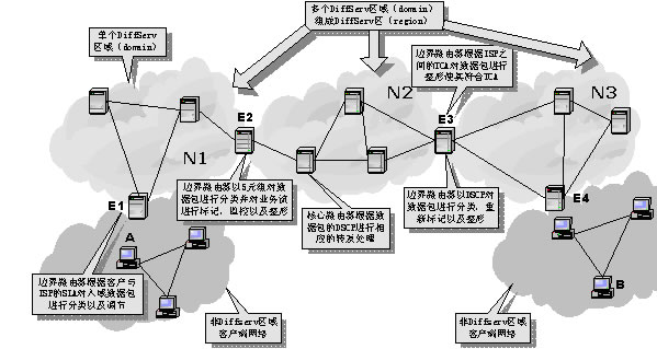 DiffServ區(qū)(region)則是由連續(xù)的DS區(qū)域構成。一個DS區(qū)內(nèi)的DS區(qū)域可以支持不同的PHB組,并且各自區(qū)域的DSCP到PHB的映射函數(shù)也可能不相同。在不同的DS區(qū)域之間,必須對SLA和TCA進行調(diào)節(jié),以協(xié)調(diào)彼此之間的服務語義。這樣,通過在上游DS區(qū)域和下游DS區(qū)域之間建立SLA或TCA,區(qū)分服務可以擴展到多個DS區(qū)域。