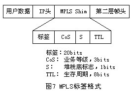 標簽的格式取決于分組封裝所在的介質(zhì)。例如,ATM封裝的分組(信元)采用VPI和/或VCI數(shù)值作為標簽,而幀中繼PDU采用DLCI作為標簽。對于那些沒有內(nèi)在標簽結構的介質(zhì)封裝,則采用一個特殊的數(shù)值填充。圖7給出4字節(jié)填充標簽的格式,它包含一個20bits的標簽值、一個3bits的CoS值、一個1bit的堆棧標識符和一個8bits的TTL值。此外.如果填充值被插入到一個PPP或以太網(wǎng)幀中,包含在各幀頭中的一個協(xié)議ID(或以太網(wǎng)類型)表示一個幀或者一個