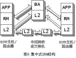 SBM有兩種形式的體系結構:集中式結構和分布式結構,它取決于BA所處的位置,如圖9和圖10所示。不管在哪種形式的結構中,RM都必須在需要請求資源的端系統(tǒng)中。APP表示需要使用RM的應用,它可以是用戶應用程序,也可以是高層協(xié)議(如RSVP)。
