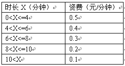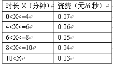 例3,國內(nèi)長途話費在時長不超過4分鐘的情況下,按0.07元/6秒收;超過4分鐘但不超過6分鐘,統(tǒng)一按0.06元/6秒收取;超過6分鐘但不超過8分鐘,統(tǒng)一按0.05元/6秒收取;超過8分鐘但不超過10分鐘,統(tǒng)一按0.04元/6秒收;超過10分鐘,統(tǒng)一按0.03元/6秒收取。