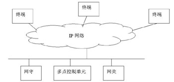 基于H.323的軟件視頻會議系統(tǒng)由相應(yīng)的協(xié)議族提供支持,使得這樣的系統(tǒng)能夠有很強(qiáng)的適應(yīng)性、兼容性。H.323建議的多媒體會議系統(tǒng)不是基于客戶服務(wù)器結(jié)構(gòu),而是基于傳統(tǒng)的電話呼叫網(wǎng)絡(luò)模式。H.323為基于網(wǎng)絡(luò)的通信協(xié)議定義了4個主要的組件:終端(Terminal)、網(wǎng)關(guān)(Gateway)、網(wǎng)守(Gatekeeper)和多點控制單元(MCU)。基本拓?fù)浣Y(jié)構(gòu)結(jié)構(gòu)如圖: