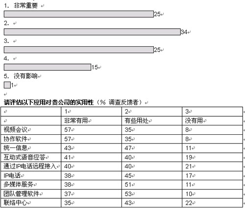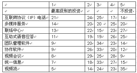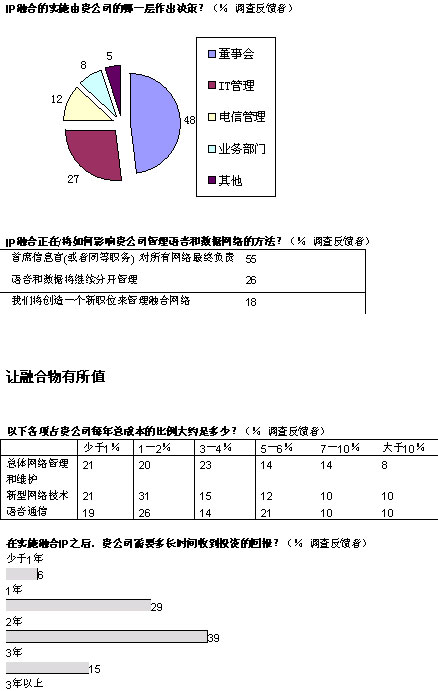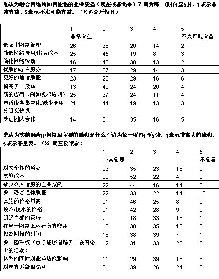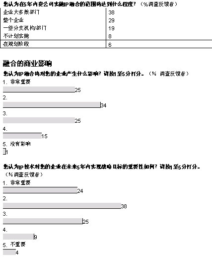 我們調(diào)查的企業(yè)中,有超過三分之二將在未來五年內(nèi)實(shí)現(xiàn)大多數(shù)或者所有部門向融合網(wǎng)絡(luò)的轉(zhuǎn)型。大部分企業(yè)采取按部就班的形式在某些特殊部門和業(yè)務(wù)開始部署。在融合應(yīng)用中,IP語音電話將在未來三年內(nèi)吸引大量投資;管理人士期望通過大幅削減公司內(nèi)部的通話費(fèi)用獲得早期的回報。在更廣泛的層面上,大多數(shù)管理者預(yù)計(jì),融合網(wǎng)絡(luò)對其企業(yè)的商業(yè)影響將會“非常重要”或者“重要”。