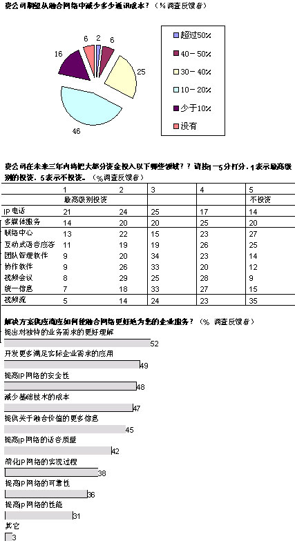 盡管如此,雖然IP融合的真正長期效益可能有利于提高員工效率,但是投資必須得到公司首席財(cái)務(wù)官的認(rèn)可。在總體網(wǎng)絡(luò)成本中預(yù)計(jì)可以節(jié)約多少?大多數(shù)公司希望削減10%-20%的費(fèi)用,也有相當(dāng)一部分公司期望減少30%-40%的費(fèi)用。上述報告中提到的實(shí)例中表明,這樣的節(jié)約是可以實(shí)現(xiàn)的。