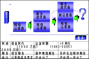 Switch(軟交換)、3G、IPv6等技術(shù)進(jìn)行系統(tǒng)構(gòu)筑,全面融合先進(jìn)的語音、數(shù)據(jù)及移動通信IP一體化解決方案,從而為企業(yè)提供不同需求層次的選擇。另外,由此導(dǎo)致產(chǎn)業(yè)結(jié)構(gòu)也悄悄地發(fā)生變化,產(chǎn)業(yè)朝三層級和多層級演變通信的新結(jié)構(gòu)和新角色:服務(wù)運(yùn)營商的誕生,網(wǎng)絡(luò)運(yùn)營商向服務(wù)提供商的轉(zhuǎn)型。