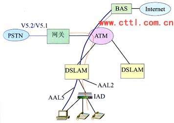 DSL的IAD與VoATMover DSL的類似,可以提供多路POTS或者ISDN接口、以太網(wǎng)接口,上行可以是ADSL或者G.shdsl接口、VDSL接口,直接接入DSLAM。不同的是,IAD與網(wǎng)關(guān)之間傳輸分組語(yǔ)音數(shù)據(jù),IAD需要配置相應(yīng)的IP地址。網(wǎng)關(guān)提供E1接口通過V5.2或者V5.1協(xié)議接入到PSTN網(wǎng)。與第一種方案不同的是,DSLAM不需要支持AAL2信元的識(shí)別,這里的DSLAM可以是ATMDSLAM或者是IP