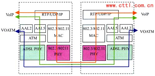 VoATM over DSL是基于ATM技術(shù)提供話音業(yè)務(wù),話音業(yè)務(wù)和數(shù)據(jù)業(yè)務(wù)分別通過AAL2和AAL5進(jìn)行封裝。AAL2技術(shù)是專為在ATM網(wǎng)絡(luò)上傳輸語(yǔ)音而設(shè)計(jì)的,在分組語(yǔ)音數(shù)據(jù)的封裝處理、多個(gè)分組語(yǔ)音數(shù)據(jù)如何在一條VC上傳送等有著嚴(yán)格的定義,它不需要為IAD配置IP地址。因此,VoATM是一種在ATM數(shù)據(jù)網(wǎng)上提供語(yǔ)音的解決方案,語(yǔ)音業(yè)務(wù)必須在AAL2信元中傳輸,只能應(yīng)用于ATM網(wǎng)絡(luò),不能應(yīng)用于以IP網(wǎng)絡(luò)為主的數(shù)據(jù)網(wǎng)。